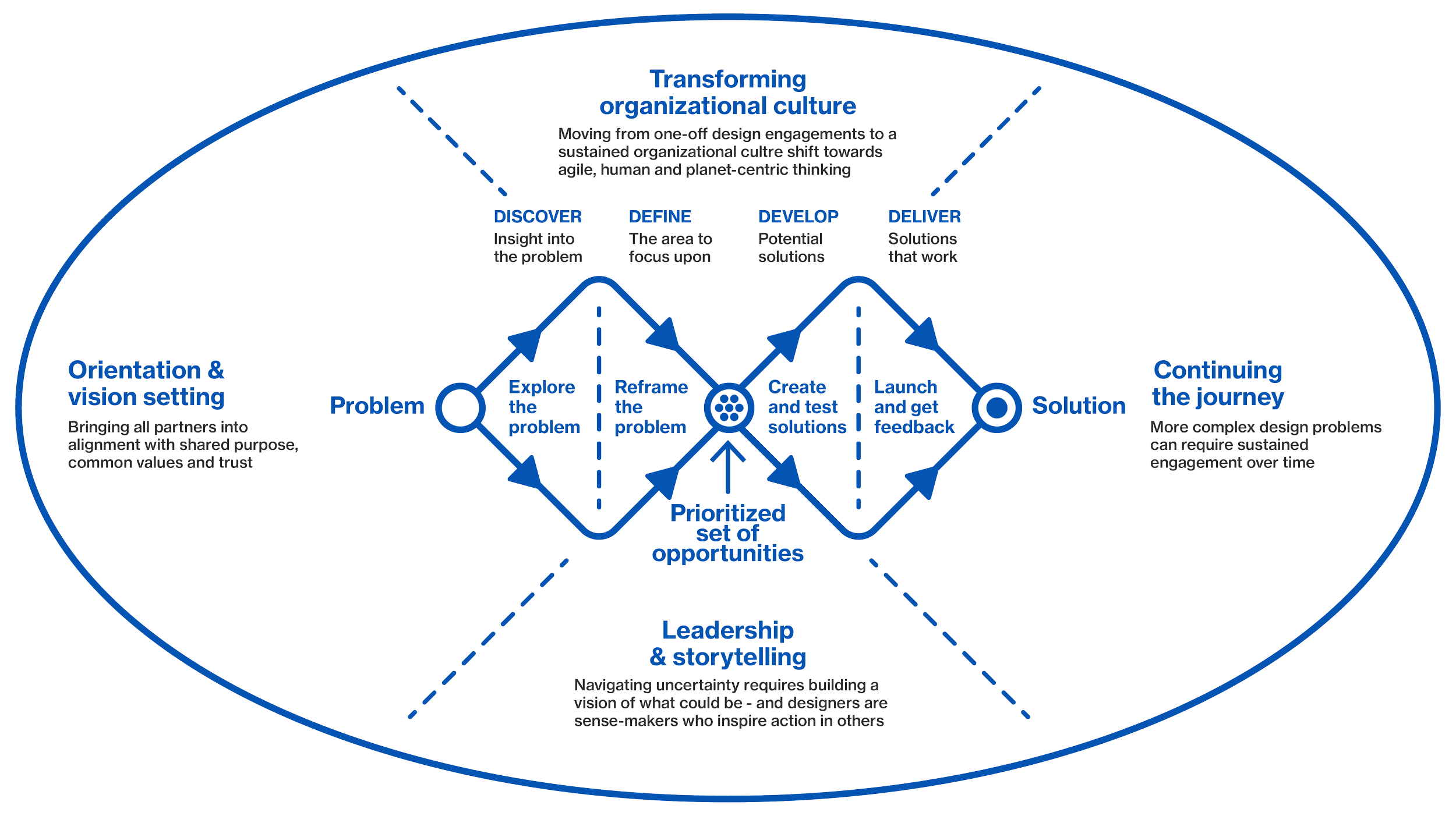 There are many frameworks for design work, and since each project is unique, the selection of frameworks is defined by its unique requirements. While I broadly follow the traditional ‘double diamond’ design process, I have evolved my approach to include systems thinking as a larger framework within which to situate design activities.