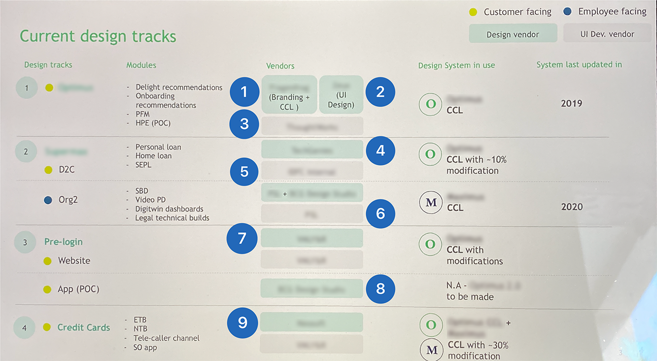 This slide shows the 9 different design and development vendors that had been engaged on the project thus far, each with their own design approaches - leading to a fragmented end-user experience.