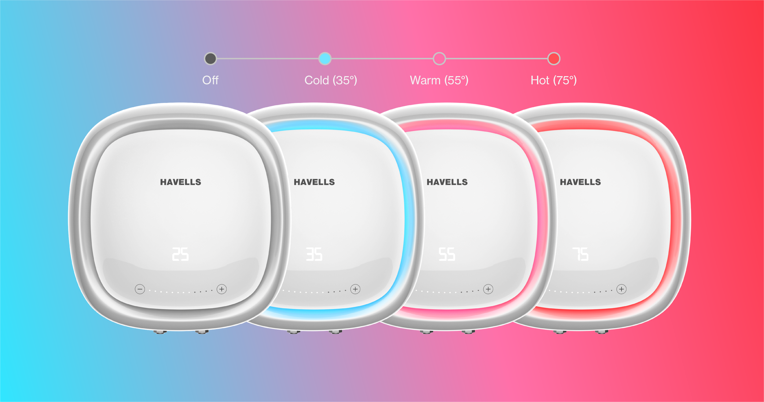 The design of the Adonia range of water heaters for Havells deals with an important and hitherto overlooked usability issue - how to indicate water temperature. Geysers the world over use Green/Red lights for this purpose, which can confuse users because of their loaded semantic messages - Go/Stop or Safe/Danger being used to indicate Cold/Hot.